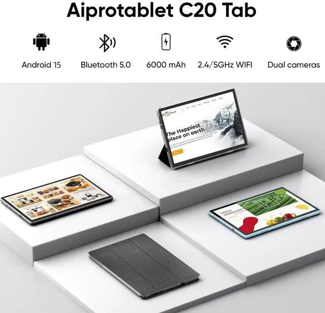 High Performance - The Aiprotablet tablet runs on Android 15 (Not Go) with a 2.0GH z Quad-Core Processor, delivering fast operation and seamless multitasking. Perfect for work, reading, studying, and entertainment ^^ Newest Model - This 10-inch Android tablet features Wi-Fi 5 ( 802.11 ac) and Bluetooth 5.0, supporting both 2.4GH z and 5GHz bands, which greatly improves connectivity stability and internet speed ^^ Massive Storage - The tablet comes with 64GB ROM and expandable up to 1TB via microSD card (not included). It comes preloaded with the Google Play Store, so you can easily download any apps you need ^^ HD Large Screen - The tablet is equipped with a 1280x800 low blue light LCD touch screen, which provides clear visuals and vivid colors, ideal for streaming videos, browsing, and comfortable reading ^^ Durable Battery - With a long-life 6000mAh battery that provides up to 5 days of continuous standby or over 6 hours of use, and fast charging via the Type-C port, you can enjoy your tablet to the fullest