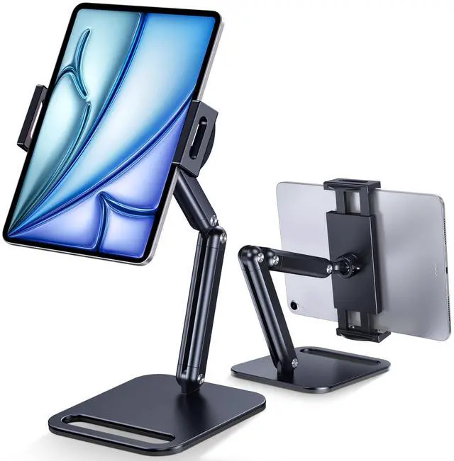 Ergonomic & Stylish Design: Complements your modern tech devices with this iPad Stand sleek appearance. Elevates up to 1.3 feet for an ergonomic, eye-level view and improved posture. Flexible dual-arm design for any angle. Perfect for playing game, watching videos, viewing photos, reading, typing, video recording, and Lamicall provide you good service. ^^ Protective &
