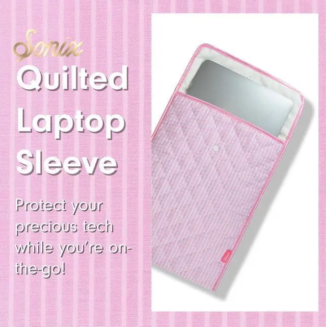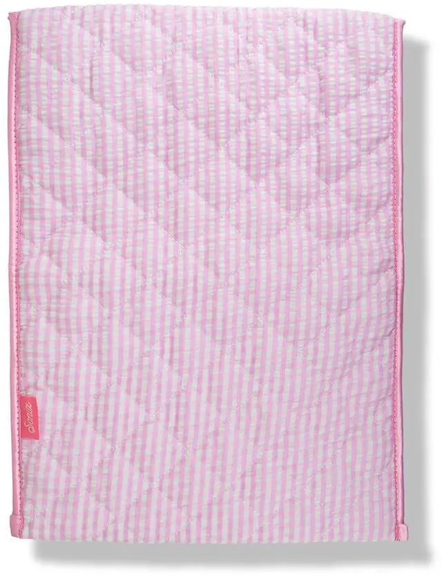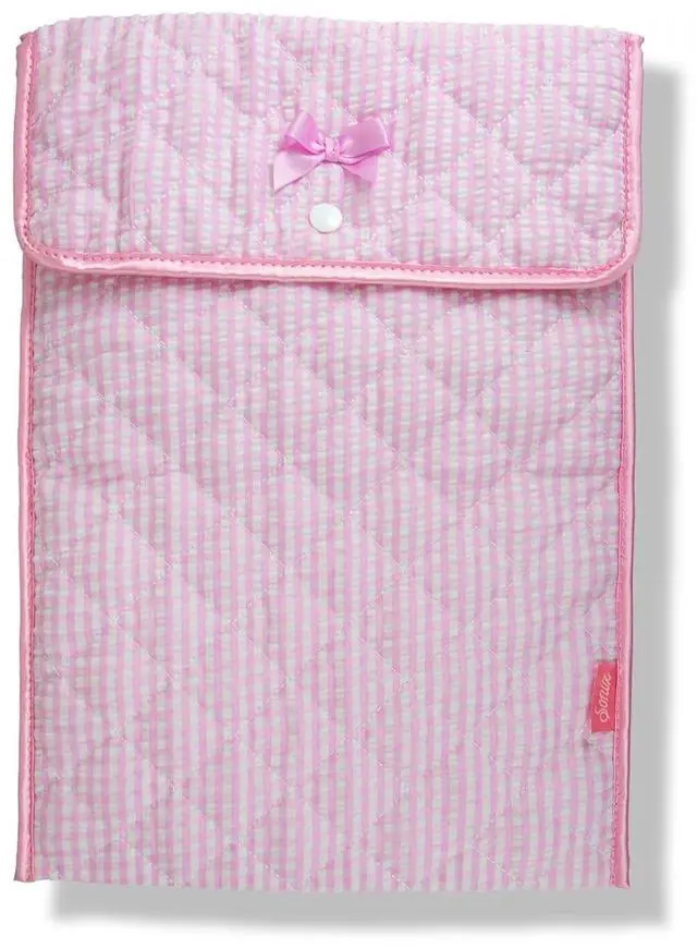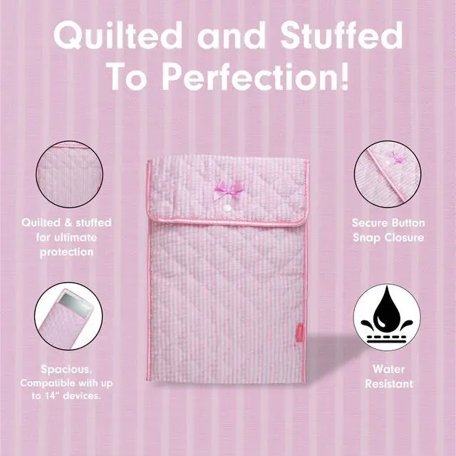 The Quilted Laptop Sleeve provides a cozy, quilted home for your precious tech. Constructed from quilted cotton fabric to keep your laptop or tablet comfy and protected while youre on the go, this lightly padded sleeve also keeps your device safe from bumps and scratches. ^^ Finesse your laptop and tablet storage with summer-y seersucker. This super lightweight fabric, in pink and white gingham, is as easy and breezy as you are! ^^ Outer sleeve is constructed from high-quality, quilted cotton fabric. ^^ Features soft satin binding, satin bow, and a secure button snap closure.