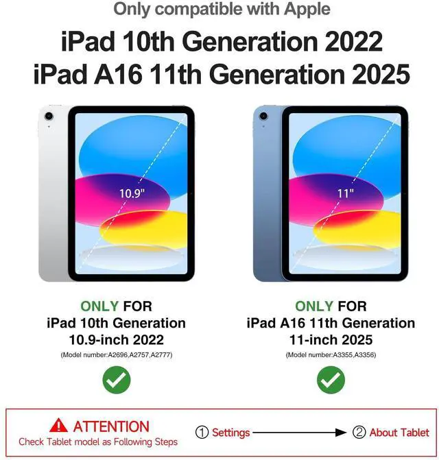 CompatibilityExclusively designed for iPad 11th Generation 11 Inch (A16) 2025 & iPad 10th Generation 10.9 Inch 2022. Unique appearance with hollow back design that it is easy to dissipate heat without increasing weight. Precise cutouts, easy access to all buttons, ports and camera ^^ Dual-layer Hybrid Military Grade Drop ProtectionConstructed in two parts, a front protective piece with raised edges to keep your iPad 11th/10th Generation screen up off surfaces and a back piece that's made of both shock-absorbing TPU and hard, drop-resistant Polycarbonate materials ^^ Built in Screen Protector and Pencil HolderiPad case 11th/10th generation with built-in screen protector prevents your iPad 11th/10th gen 11/ 10.9 screen scratches without compromising sensitivity.