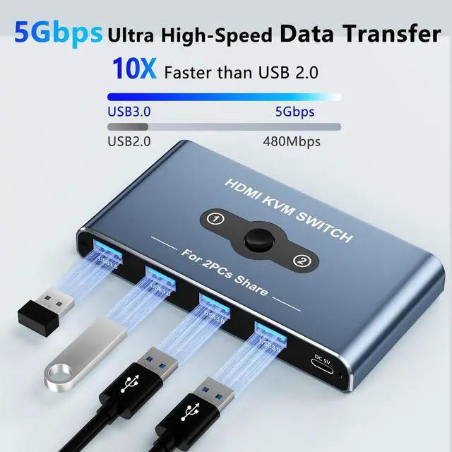 ^^ High-Speed USB 3.0 PortsEquipped with 4 USB 3.0 ports, our KVM switch supports ultra-fast data transfer rates up to 5Gbps, perfect for connecting peripherals like mice, keyboards, printers, webcams, and USB sticks. It is also backward compatible with USB 2.0, 1.1, and 1.0, ensuring versatile connectivity for all your devices. ^^ Stable OperationThe KVM includes a 5V power port and provides a USB-C power cable. (the current provided by the PC host is small, and it cannot support USB devices such as hard disks). With an external power design, USB devices can get a stable working environment through the switch.