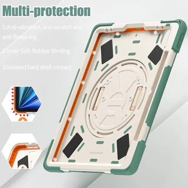 Hand Strap Design: With a 360 rotating hand strap design, this case offers versatile handling options, allowing you to comfortably carry your iPad Air in any orientation, making it ideal for on-the-go use. ^^ Foldable Portable Stand and