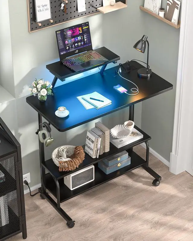 ^^ Multi-Function: Use moveable monitor stand can raise your monitor to the right height, reducing back and neck strain and pain. Round angle table design can improve safety during use. The rolling computer desk equipped with 4 high-quality smooth rotary wheels and 2 extra desk iron hooks, 2 tier opening storage shelves can store and display your items. ^^ Simple Assembly and