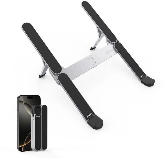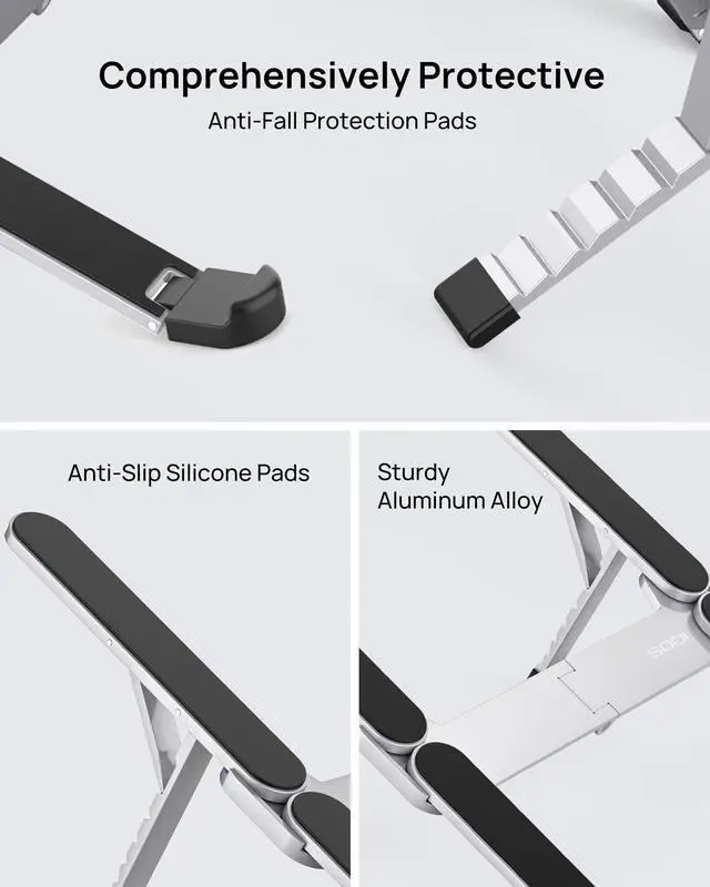 Innovative & Ultra Compact The silver SODI 314 laptop stand weighs only 185g (iPhone 16 Pro weighs 199g) and folds up to 12.7 * 4.4 *2cm, making it ultra light and easy to carry in your backpack or pocket for effortless mobility. Perfect for business trip, daily travel, library, cafes work, etc. ^^ Innovative & Spring-loaded Unlike conventional PC stands, the adjustable arm adopts spring design can align screens to eye level for ergonomic comfort in 1 second. It can also be adjusted in 6 different heights to meet different angle needs for desk.