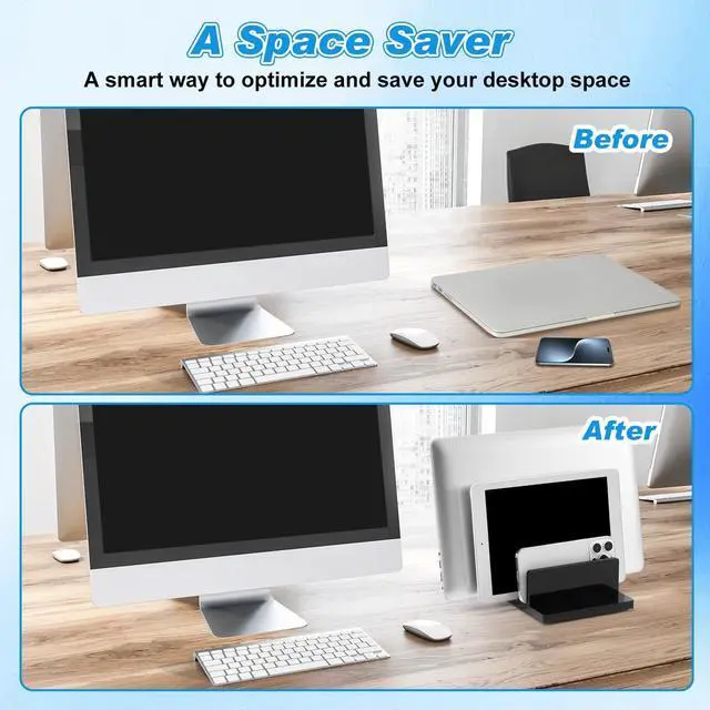 Detailed Design: the non-slip silicone pad at the bottom ensures stability, prevents the stand from sliding and causing the device to collapse, and provides maximum protection; The vertical storage design prevents the laptop air outlet from being blocked, enhances air circulation, and accelerates heat dissipation ^^