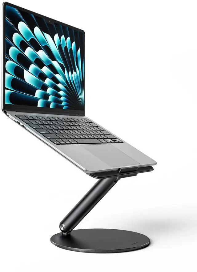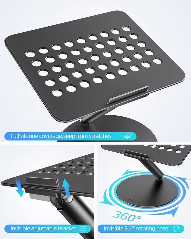 360 Rotation Base Laptop StandLULULOOK rotating laptop stand for desk allows you to easily share your screen with someone sitting across the room or at another desk. This is the perfect solution for anyone who works in an open office plan and wants to participate in meetings without leaving their workstation. It also works great for ideas sessions when collaborating with others over video chat or calls. ^^ Foldable & Height AdjustableThis desktop laptop stand was designed as an amazing adjustable computer pulpit stand that can easy be adjusted for zoom conferences and meetings, watching a movie, video gaming or can even be used for cooking as a cookbook stand.
