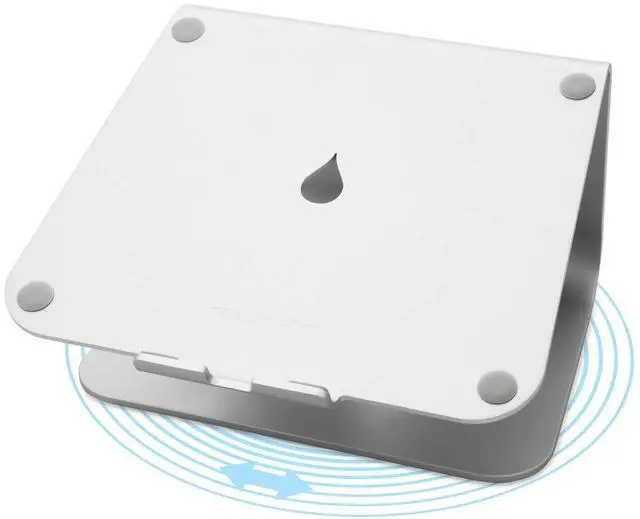 Introducing the mStand360, a laptop stand with swivel base, for professionals who require an elegant way to share the screen while enjoying stability. The mstand360's body is a single solid piece of aluminum with high quality sand-blasted and silver-anodized finish that matches Apple Notebooks. Its aluminum rotating base has a super slim profile of only 0. 1" Inch (0. 2mm) to maintain the same sleek lines as the original stand. The mStand360 raises the notebook screen to eye level for better posture and view. The stand is also ideal for use with an external display, raising the laptop screen to the same height for more comfortable viewing while also clearing up desk space.
