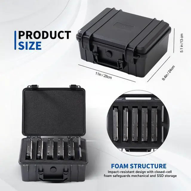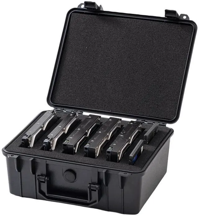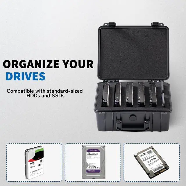 This Hard Drive Case securely stores 5x 3.5" HDDs and 2x 2.5" SSDs, offering professional-grade protection for your data. Made from high-density PP plastic, it is lightweight yet durable, with IP54 splash resistance for added safety. The pre-cut foam inserts keep your drives snug and secure, while anti-static padding and shock-absorbent design protect against impacts, vibrations, and electrical damage. Perfect for photographers, IT professionals, and anyone needing reliable storage on the go.