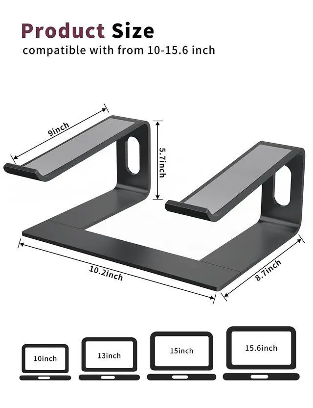 Broad Compatibility - Suitable with laptops of 10 to 15.6 inches, such as MacBook Pro 13/15, MacBook Air 13.3, Dell, XPS, Lenovo, HP, ASUS, Google Pixelbook, Samsung and other notebook computers of 10, 11, 12, 14, 15.4, 15.6 inches, etc. ^^ Ergonomic Design - Elevates your laptop height by 6 inches, a perfect height for your eye, neck and shoulder. ^^ Durable & Protective - Metal appearance made of thickened aluminum alloy, strongly durable. The rubbers on the top and bottom of holder ensure it sticks tightly to your laptop and desk, and protect your computer and desktop from scratches.