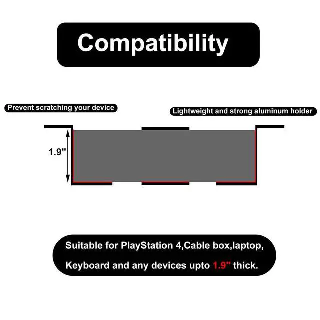 ^^ Application: Each under desk storage shelf 4" long, 1.5" wide, 1.9" tall. Suitable for PlayStation 4, Routers, Cable box, laptop and any devices upto 1.9" thick.