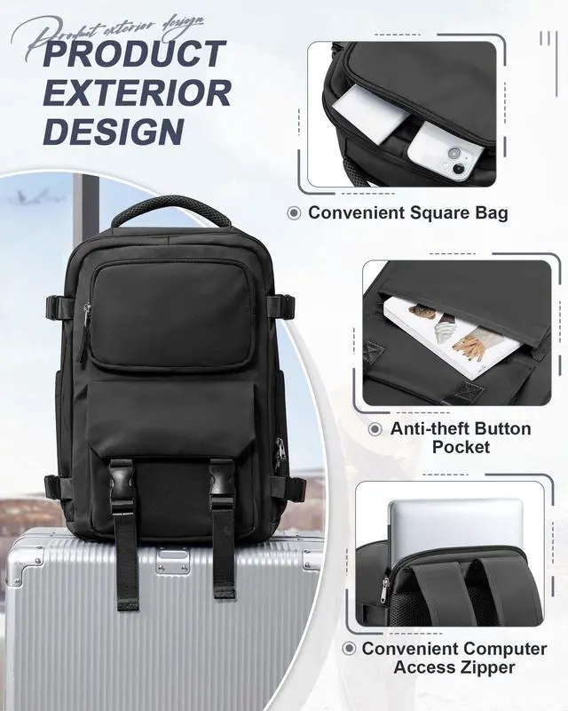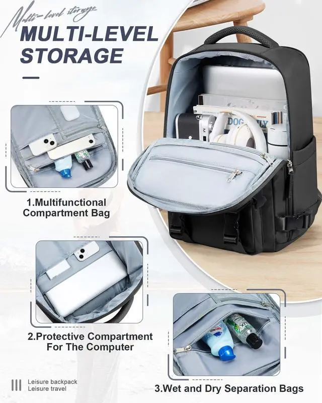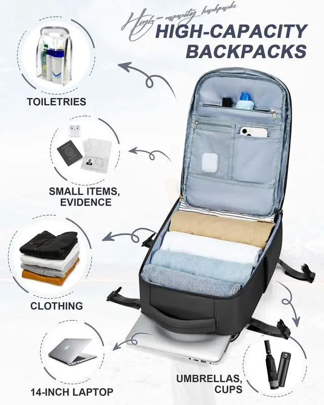 Weight: 2.5L b/ 1.12K g. Fits most airline regulations. 180 degree zipper closure helps you pass through the security check quickly. Easy to put in luggage rack or under seats. Our backpack is not only perfect for travel, but also for everyday use. The trolley sleeve allows you to conveniently slide it over the handle of your luggage for easy transport. ^^ Comfortable and DurableThe adjustable breathable shoulder straps and padded back panel ensure a comfortable fit, even during long hikes or city explorations. Made from high-quality materials, our backpack is built to last and withstand whatever your adventures may bring. ^^ Roomy Capacity & Multi-Pocket The Backpack has 1 main large compartments and 8 allocated inner pockets and side pockets. Makes your item organized and easier to find. College laptop bookbag backpack with laptop compartment holds a 17 inch laptop and a 12.9 iPad, travel backpack providing a dedicated space for your pen, textbooks, wallet, clothes, shoes, bottle and other travel essentials. ^^ Anti-theft Multifunctional BackpackThere is a zipper pocket on the back of the bag, which can store valuables such as mobile phones and iPads, which is anti-theft and convenient.