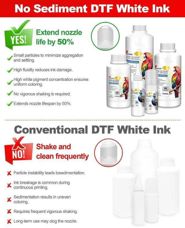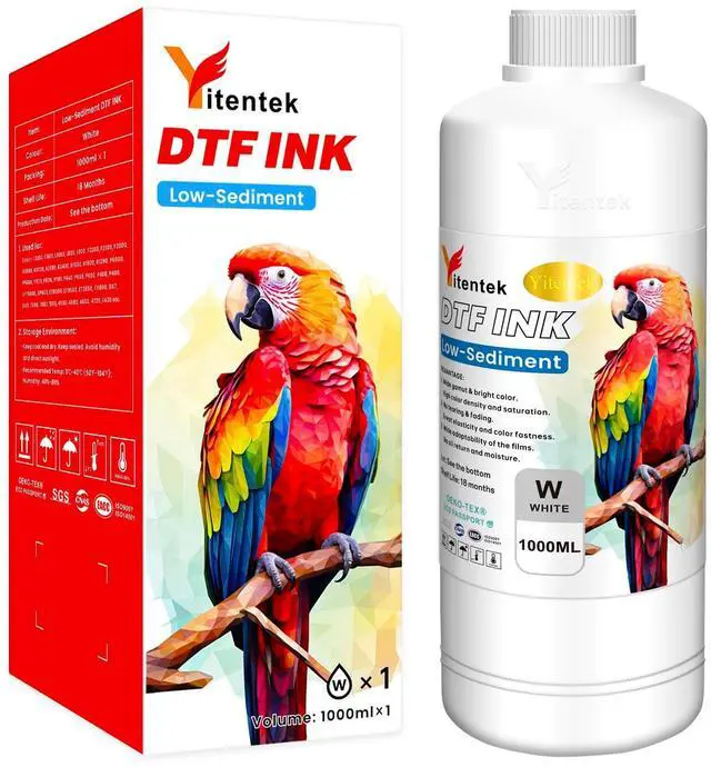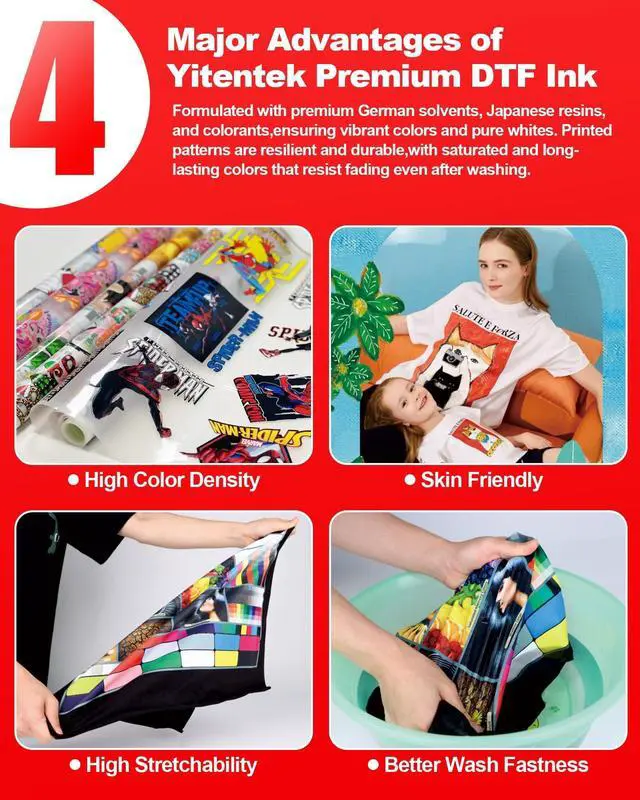 UPGRADED FORMULA Yitentek DTF ink features an exclusive patented Low-Sediment formula, combining premium German solvents, Japanese resins, and high-quality colorants. This unique formulation ensures excellent ink flow and color fastness, resulting in vibrant colors, pure whites, and soft, durable printed patterns. Our ink provides high coverage on all DTF films, featuring a wide color gamut with exceptional density and saturation that remains washable and fade-resistant. ^^ EXTENSIVE COMPATIBILITY Yitentek DTF Ink is compatible with a wide range of printers, including the L Series (L800, L805, L1800), ET Series (ET-8550, ET-8500, ET-2400, ET-2800, ET-2803, ET-2850, ET-3850, ET-4800, ET-4850, ET-15000), XP Series (XP-15000, XP600), R Series (R1390, R1800, R1900, R2000, R2400, R2880, R3000), P Series (P400, P408, P600, P608, P640, P700, P800, P900), Stylus Pro Series (3880, 4800, 4880, 4900, 7880, 7890), and SureColor Series (P5000, P6000).