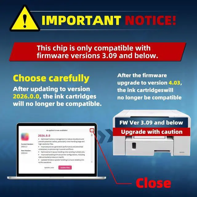 Important Note: This chip is only compatible with SG500 and SG1000 printers running firmware version 3.09 or earlier. The new version of the SPU printing software will force an update to version 4.03, which is incompatible with the ink cartridges. Please choose carefully.