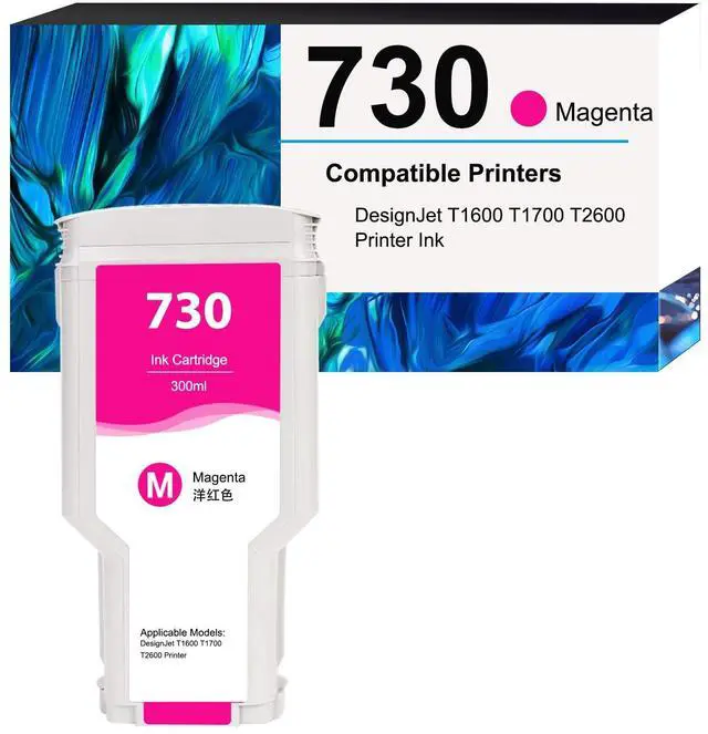 730 Ink Cartridge Replacement for HP 730 Ink Cartridge Magenta ^^ For hp 730 ink cartridges Printer CompatibleCompatible with HP DesignJet T1600 T1700 T2600 Printer ^^ Designjet 730 ink Cartridge Capacity 300ML ink per 730 ink cartridge(A4 Letter, at 5 Percent Coverage) ^^ 730 ink cartridges for HP printer combo Package ContentsDesignJet 730 Ink Cartridge Magenta (P2V69A) ^^ 730 inkThe ink cartridge provides high-quality printing, clear printing, and does not fade for a long time, providing you with vivid and natural printing effects. The products are suitable for schools, companies, families, etc.