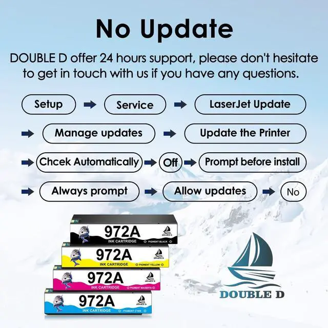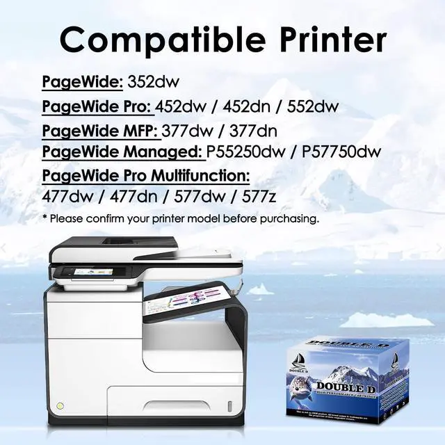 Chip Upgrade Device Upgrade to the latest version at any time with the upgrade device, no headachesc about the printer not recognizing the ink cartridge ^^ Compatible Printers Pagewide 377dw, 377dn, 477dw, 477dn, 577dw, 577z, 452dn, 452dw, 552dw, P55250dw, P57750dw Printer ^^ Packag Contents1 x Black 972A, 1 x Cyan 972A, 1 x Magenta 972A, 1 x Yellow 972A, 1 x Chip Upgrade Device, 1 x Gloves, 1 x User Guide ^^ Extra High Yield 3, 500 pages per Black 972A ink cartridges, 3, 000 Pages per Cyan 972A Magenta 972A, Yellow 972A (at 5% coverage) ^^ Advantages Multiple Certifications, Premium Print Quality, Cost Effective, Newest Chip, Secure PackedShow Ink Level ^^ Reliable SupportDOUBLE D offer 24 hours support, please don't hesitate to get in touch with us if you have any questions