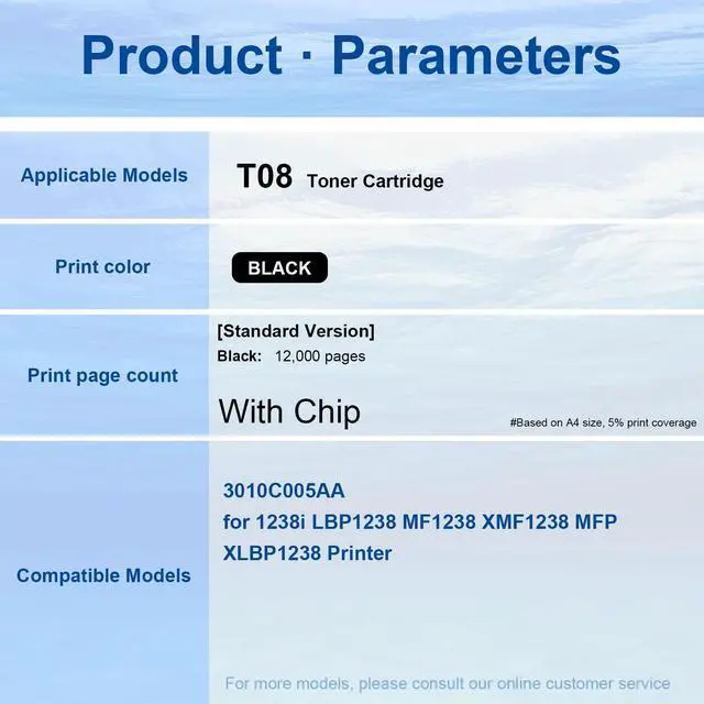 Compatible With Compatible With Canon ImageCLASS LBP1238 X LBP1238 II X MF1238 X MF1238 II toner Cartridge T08 printer ^^ Product Code 3010C005AA printer ^^ High Page Yield Up to 12, 000 pages per Black at 5% coverage of A4 paper ^^ With Chip The T08 T-08 T 08 toner cartridge is equipped with an chip that printer proactively monitors page count and toner levels ^^ Installation Tip Before installing LBP1238 X LBP1238 II X MF1238 X MF1238 II toner Cartridge, Just insert them, and you're all set ^^ Important Reminder To ensure proper functionality, please verify your devices compatibility with our 3010C005AA toner cartridges before purchasing