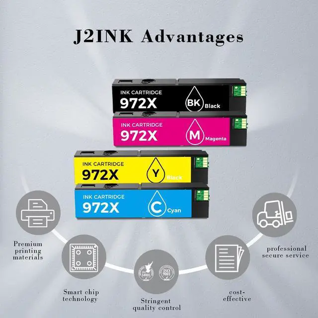 J2INK for 972x ink cartridges Includes: 4 new 972xl 972a ink cartridges 1 for 972x black ,1 for 972x Cyan,1 for 972x Magenta,1 for 972x Yellow