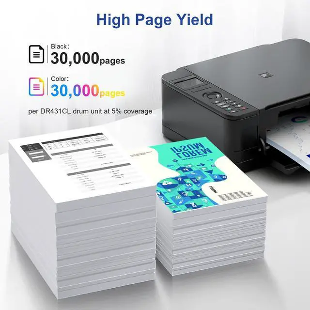 • Page Yield: Up to 30,000 pages per DR431CL DR-431CL drum unit at 5 percent coverage of A4 paper.