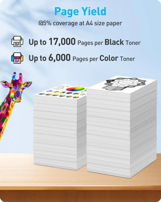 ^^ Exceptional Page Yield: Deliver substantial output with a yield of up to 17, 000 pages from the black toner and up to 6, 000 pages from each color toner, based on standard 5% A4 page coverage.