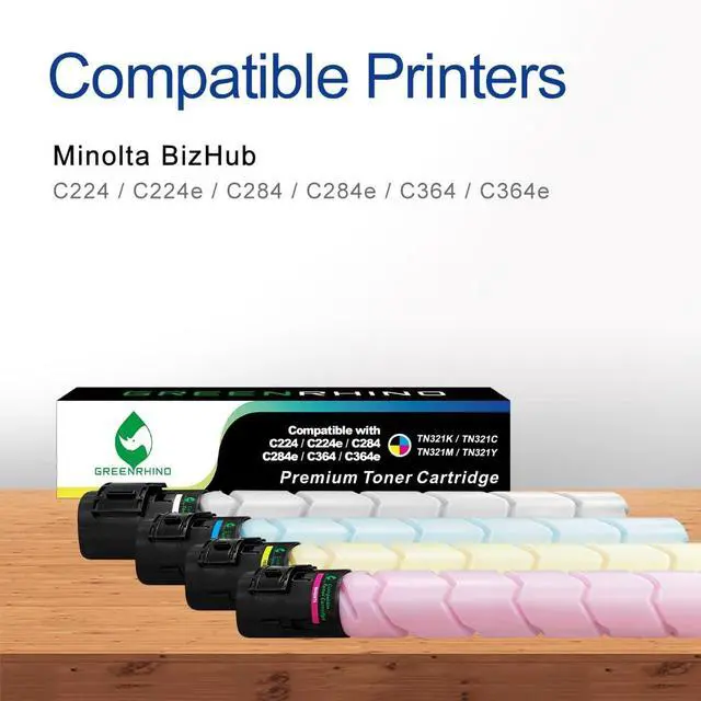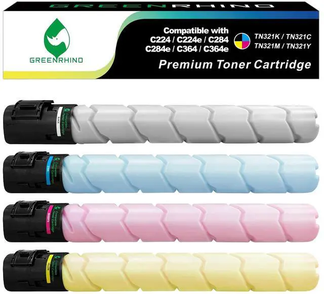 Package Contents: 1 Black-TN321K (A33K130); 1 Cyan-TN321C (A33K430); 1 Magenta-TN321M (A33K330); 1 Yellow-TN321Y (A33K230) Compatible Toner Cartridges ^^ This is an Alternative Replacement for OEM Toner Cartridge ^^ GREENRHINO was Established in June 2001, and Using Only the Best and Right Combination of Components for each Model of Cartridge.