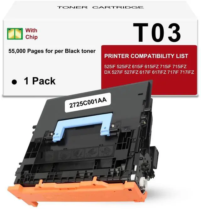 Compatible Printer T03 toner cartridge is compatible with ImageRunner Advance 525iF 525iFZ 615iF 615iFZ 715iF 715iFZ DX 527iF 527iFZ 617iF 617iFZ 717iF 717iFZ Printer ^^ Original Part Code2725C001AA ^^ Package Contents1 x T03 Black Toner Cartridge ^^ Page Yield 55, 000 Pages per T03 Toner Cartridge ^^