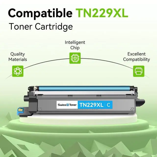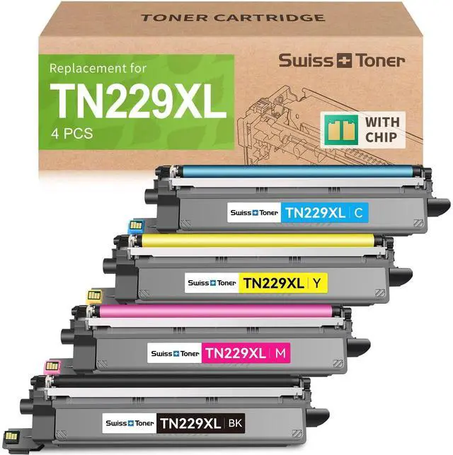 Package Contents 1 x TN229XL black toner, 1 x TN229XL cyan toner, 1 x TN229XL magenta toner, 1 x TN229XL yellow toner. (Total 4 Pack With Chip) ^^ Compatible Printers swiss toner TN229XL TN229 toner cartridges replacement for HL-L3280CDW, HL-L3300CDW, HL-L3220CDW, MFC-L3780CDW, MFC-L3720CDW, HL-L3295CDW, HL-L8245CDW, MFC-L3765CDW, and MFC-L8395CDW. ^^ High Page YieldUp to 3, 000 pages for the TN229XL black toner cartridge and 2, 300 pages for TN229XL color toner cartridge (Letter/A4, at 5% coverage) ^^ With Chip swiss toner TN229XL toner cartridges come with pre-installed smart chips, enabling immediate identification by your printer.