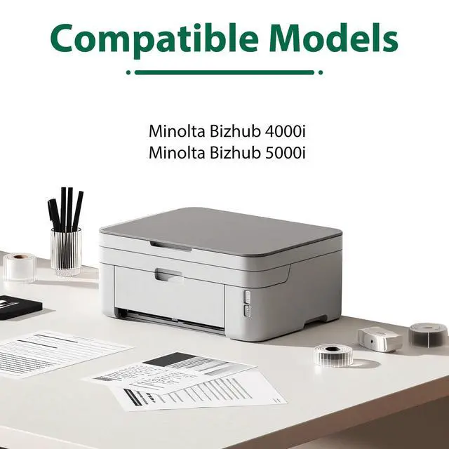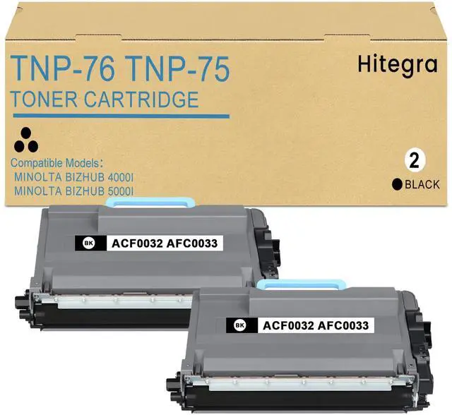 Remanufactured TNP-76 Toner Cartridge - TNP76 toner cartridge with 2 pack (Black / ACF0032 AFC0033), upgraded materials and chip bring the perfect printing experience ^^ High Capacity Yield Pages - TNP75 toner cartridge up to 12, 000 pages for black, based on 5% coverage of A4/Letter ^^ Compatible with Printers - TNP76 toner cartridge replacement for Konica Minolta Bizhub 4000i 5000i printers ^^ ACF0032 AFC0033 Black Toner for Hitegra - Bizhub 4000i toner can automatically recognize the printer, and press determine key according to the reminder after connecting the printer. Compatible cartridge can provide printing for clear and natural print result ^^ Be Widely Used - Hitegra TNP-76 TNP75 black toner cartridge is widely used in a variety of occasions, including banks, hospitals, schools, companies, shops and so on, whether it is home printing or office printing can be used ^^ Satisfactory Experience - Bizhub 5000i toner cartridge offers reliable compatibility and produce clear text and vivid image effect.