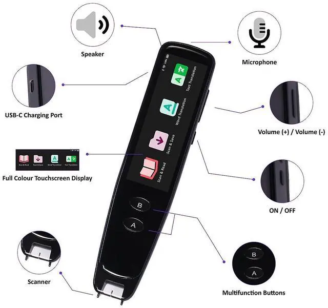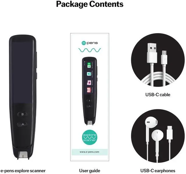 ^^ [VOICE RECORDER] Speak directly to the device as a recorder and listen back to your recordings later at any time, supporting revision and language practice. ^^ [TOUCHSCREE] Effortlessly navigate using a smooth and intuitive interface suitable for all ages. A full-colour touchscreen with icons designed with accessibility at the forefront. ^^ [INCLUDED EARPHONES] USB-C analogue earphones included when you buy e-pens explore scanner. ^^ [OFFLINE SUPPORT] Even when offline, e-pens explore scanner connects you to reading materials via offline features including converting printed text to speech for accessibility and learning. ^^ [GREAT VALUE] A durable and reliable device filled with the best pen scanner features, all bundled at a reasonable price youll love.
