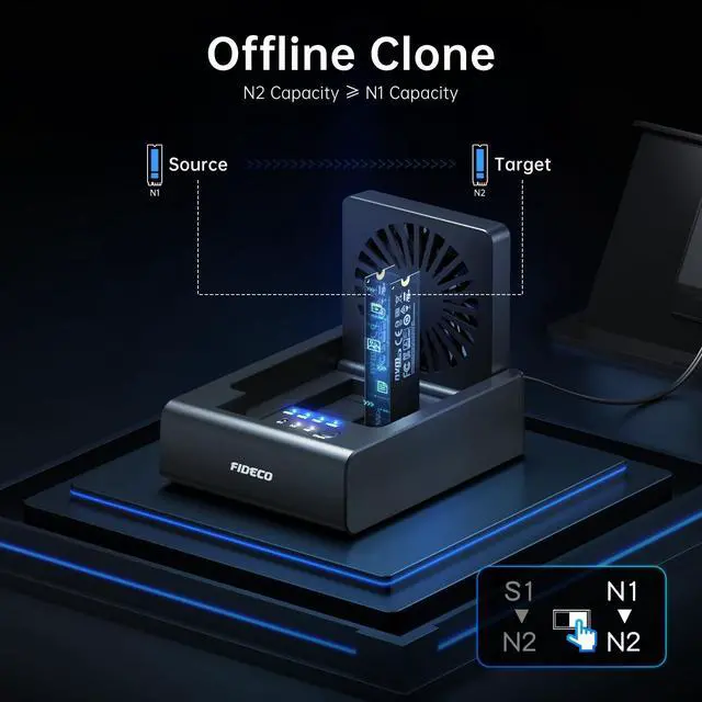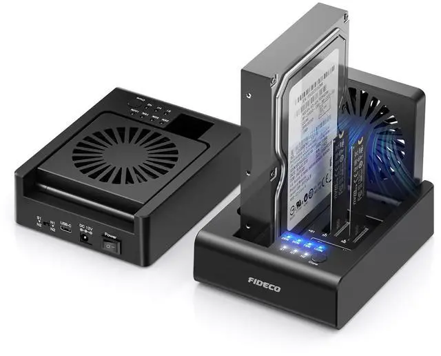 One Dock for AllFIDECO 3-bay hard drive docking station can support M. 2 PCIe NVMe SSD with M-Key or M+B Key and 2.5 / 3.5 inch SATA HDD/SSD. The hard drive reader allows you to connect and access 2 NVMe SSDs and one 2.5" / 3.5" SATA HDD simultaneously, meeting your needs for different storage setups. ^^ Flexible Offline CloneFIDECO NVMe cloner dock can support offline clone between multiple types of hard drives. Just push the clone conversion switch to choose the way of clone: NVMe NVMe, or 2.5" / 3.5" SATA NVMe. Generally, for offline clone from NVMe (1TB) to NVMe (1TB), it takes about 20 minutes. Greatly save your time and effort! ^^ Warm Note for Offline CloneStart the offline clone with just a single touch for 3-5 seconds. No software is needed! Before offline clone, do ensure the target hard drive capacity is equal to or larger than the source hard drive capacity by checking both disks in Windows "Disk Management". If 4 blue lights are flashing, it means the clone failed. ^^ High-Speed Data TransferFIDECO NVMe SSD reader features USB 3.2 Gen 2 standard for maximum 10Gbps super fast transfer speed. Transfer large files within minute with no lag. For 2.5 / 3.5 inch SATA hard drive, the maximum data transfer speed can reach 5Gbps to meet your daily needs. ^^ Ultimate Heat DissipationFIDECO NVMe duplicator is equipped with a foldable cooling fan, offering you the much cooler operating environment to help protect your hard drives from overheating, ideal for professionals managing large amount of data or game players. ^^ Wide CompatibilityDesigned to work flawlessly with Windows, Mac OS, and Linux.