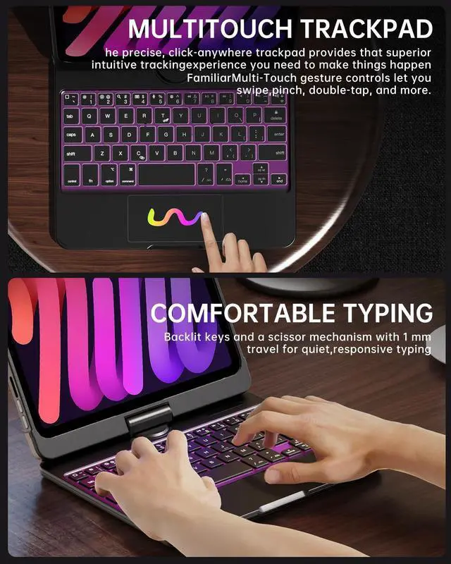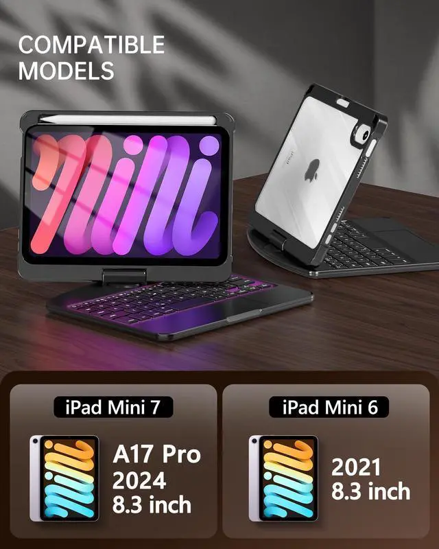 Intermerge Case with Keyboard for iPad mini 7 (A17 Pro, 2024) & Mini 6 (2021) 8.3" - 360 Swivel Multi-Touch Trackpad, 7-Color RGB Backlit Keys, Pencil Holder, Power Indicator-Solid Black