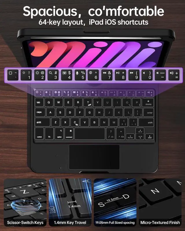 Magnetic, detachable keyboard with scissor-switch keys for quiet typing. Customize with 7 colors and 3 brightness levels.