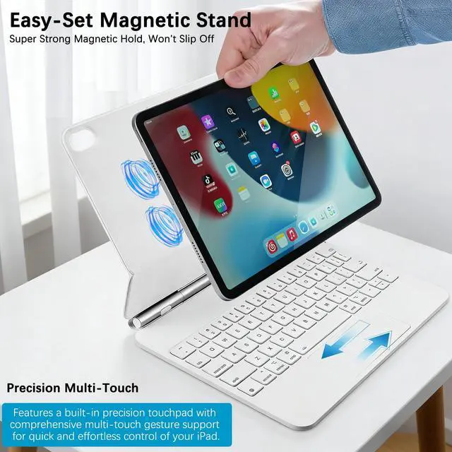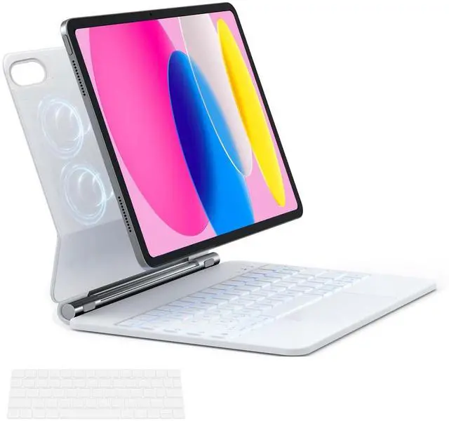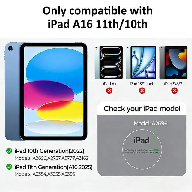 Wide Compatibility only compatible with iPad 11th(A16, 2025)/10th Generation; models A3354A3355A3356A2696A2757A2777A3162. Please verify your tablet model before purchase to ensure perfect compatibility. ^^ Adjustable Angle Magnetic StandFeatures a powerful magnetic design with 37 built-in magnets for secure attachment. Angle easily adjusts up to 130 for comfortable typing, video viewing, or web browsing. ^^ 12 Function Keys & Precision Touchpad 1.3 mm key travel delivers responsive feedback, while 12 practical function keys boost productivity. The AG glass precision touchpad offers smooth, accurate control. High sensitivity combined with a fingerprint-resistant surface keeps it clean.