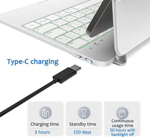 ^^ 7-Color Backlit KeysThis 11-inch iPad Air keyboard features a backlit design, ensuring uninterrupted typing in low-light conditions and clear visibility even in dim environments. With 3 adjustable brightness levels and 7 color options, it creates ambiance while protecting your eyesight. It showcases your unique style while delivering a comfortable typing experience. ^^ Multi-Touch TrackpadThe keyboard integrates a precise trackpad, allowing users to effortlessly scroll and swipe to control their iPad. Simply slide your finger anywhere to perform a click action, enabling laptop-like functionality. This feature provides significant assistance, making your work and daily life incredibly convenient.