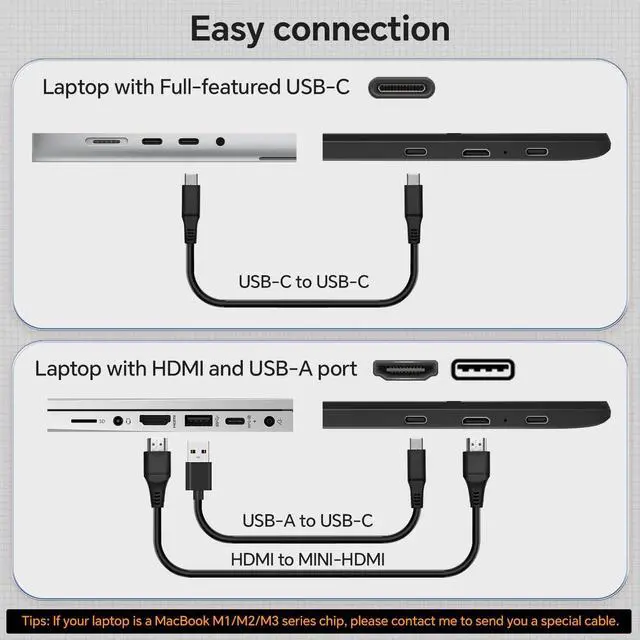 Non-Type-C laptops can use the included USB-A + HDMI cable. Compatible with Windows, macOS, ChromeOS, Linux. Setup is quick, simple, and effortless for any device or user ^^ Warranty & Customer ServiceFEZOBR offers a 12-month warranty for portable laptop monitor. Due to the limitations of some laptop port types, not all laptops are suitable for this product. If you encounter connection failure, please contact us at anytime and we will provide you with a satisfactory solution.