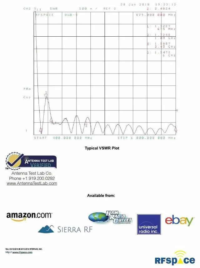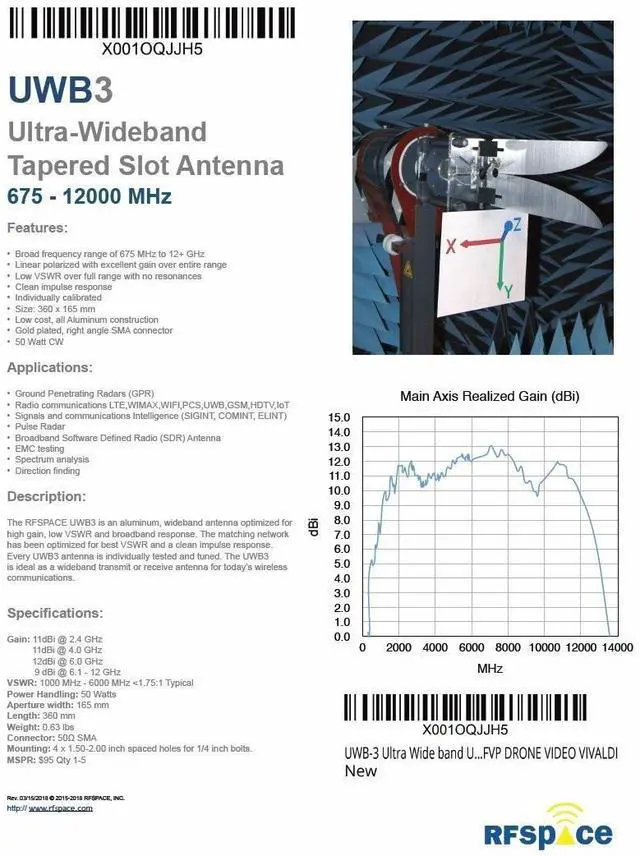 RFSPACE UWB-3 Ultra Wide Band UWB Antenna 675-12000+ MHz. This is a passive antenna and does not require FCC ID.
