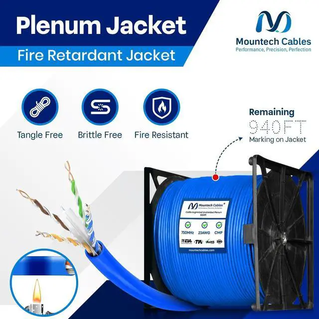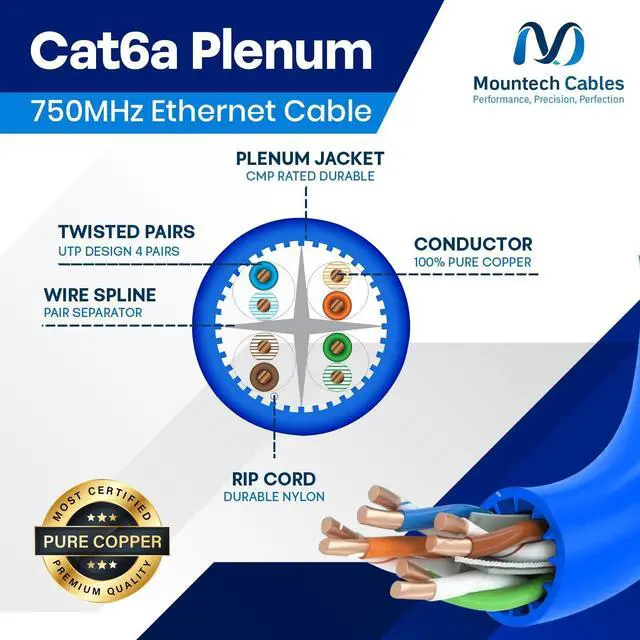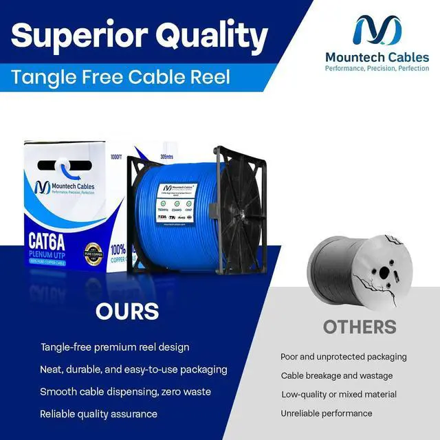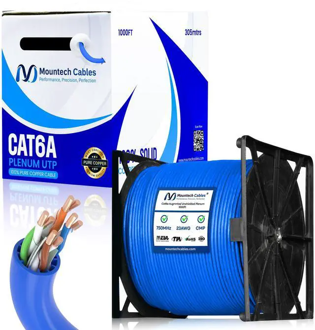 - This Cat6a plenum 1000ft ethernet cable delivers blazing-fast speeds up to 10 Gigabit with 750MHz bandwidth, ensuring smooth data transfer, gaming, and streaming without lag. ^^ % Built with pure solid copper (23AWG) for superior conductivity, minimal signal loss, and long-lasting durability. This Cat6a unshielded 1000ft plenum cable guarantees reliable and consistent performance. ^^ - Flame-retardant plenum (CMP) jacket with low-smoke and low-toxicity design. Safe for use in plenum air spaces above ceilings or below raised floors in both residential and commercial installations. ^^? -- Comes with a tangle-free reel-in-a-box design for hassle-free pulls, accurate length tracking, and mess-free setup.