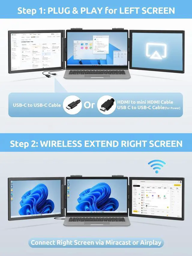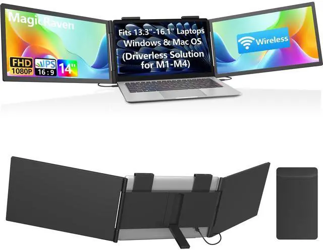 Innovative Hybrid Connection: Wired + Wireless Unlike traditional extenders that require multiple cables, MagicRaven features a revolutionary hybrid design. One screen connects via a USB-C or HDMI & Power cables, while the second screen connects wirelessly. This unique setup solves the issue of scarce laptop ports, keeping your workspace clean and clutter-free without the need for complex docking stations.