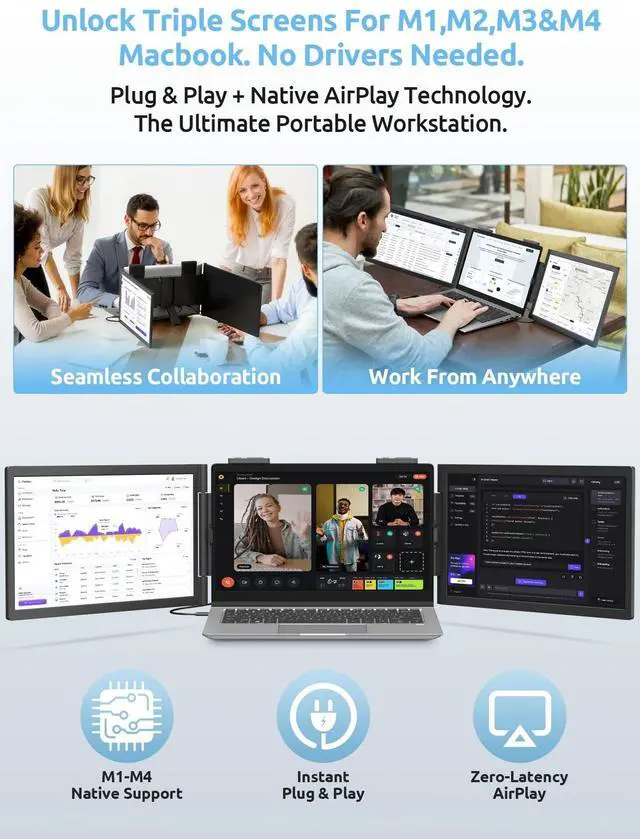 Driver-Free Triple Screen for MacBook M1/M2/M3/M4 Break free from the single-screen limit of MacBook Air base chips without installing any drivers or apps. Unlike traditional extenders that rely on complex software, MagicRaven uses a Hybrid Connection (USB-C + AirPlay). Simply plug in one screen and wirelessly cast the other for an instant, privacy-safe triple-monitor setup. True plug-and-play efficiency for Apple users.