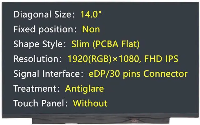 Diagonal Size 14.0"F ixed positionNonShape StyleSlim (PCBA Flat); Resolution1920 (RGB) 1080, FHD IPSSignal InterfaceeDP/30 pins ConnectorTreatmentAntiglareTouch PanelWithoutComes with Complimentary Double Sided Stretch Release Adhesive Tape for Installation.