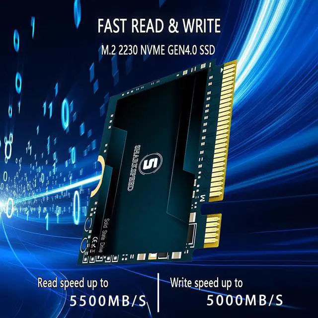 Efficient TransferThe M. 2 2230 NVMe SSD read speed of up to 5500MB/s and a write speed of up to 5000MB/s (1TB), enabling faster data access, boot, and file transfer, improving the overall system response. It can speed up games, and improve productivity in the office. ^^ High Performance & System StabilityS SHARKSPEEDs newly upgraded M. 2 2230 SSD offers nonparallel high performance with the latest 3D NAND flash technology, an intelligent TLC chip, state-of-the-art components, and smart optimization to quickly upgrade your laptop or desktop PC.