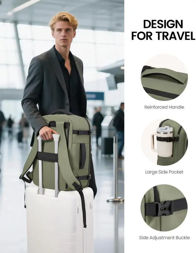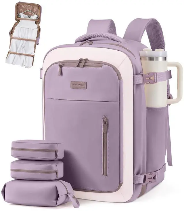 A roomy wet/dry pocket accommodates all types of toiletries, and a 40 oz. water bottle fits easily in the side pocket. ^^ Effortless Travel DesignThis backpack meets airline personal item limits. The 180 opening makes airport security checks a breeze. Securely attach your backpack to your suitcase using the luggage strap and enjoy hassle-free mobility. ^^ Durability Meets ComfortDesigned for comfort on the go, this backpack features high-quality, durable materials. It has padded shoulder pads to relieve back stress. Thick padded compartments protect laptops and tablets. ^^ Adaptable for Versatile OccasionWith sturdy side handles, this backpack offers versatile carrying optionshandheld, over-shoulder, or luggage-mounted.