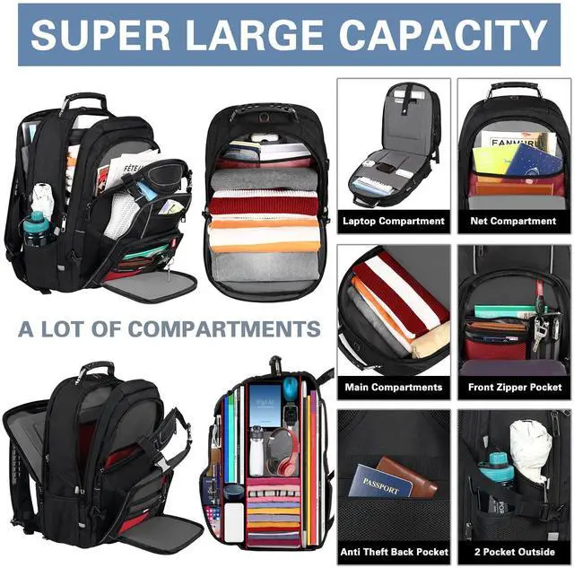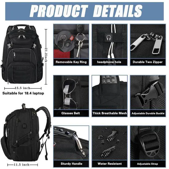 RFID Backpack & Anti-Theft: The front pocket of 18.4 inch Laptop backpack for men with advanced RFID security technology, unique metal composites identification helps secure personal data encoded on you credit cards, IDs and passports. The oversized anti-theft pocket on the back of the backpack makes it easy to put your phone, passports and wallet.