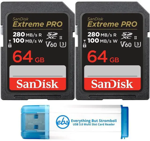 The SanDisk 64GB Extreme Pro SDXC Memory Card Bundle with Everything But Stromboli 3.0 Micro & SD Card Reader is the ultimate solution for professional photographers and videographers who demand speed, performance, and reliability. This bundle equips you with the tools you need to capture every moment with stunning clarity and precision and includes (2) 64GB SanDisk Extreme Pro SD Cards and (1) Everything But Stromboli Micro & SD card reader.