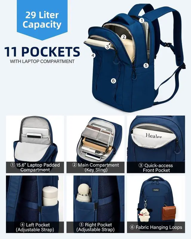Airline Approval & Laptop ProtectionMeasuring 17.728. 2712.21 inch / 452531cm, this carry on backpack fits snugly in overhead compartments or under most airline seats. The plush-lined, padded compartment securely cushions and protects laptops (up to 15.6 inches) from bumps and impacts, making it an ideal laptop travel backpack for work or study trips. ^^ Large Capacity & Smart OrganizationWith 29L capacity and 11 thoughtfully designed pockets, this travel backpack for women includes a built-in keychain for easy tracking. External side pockets with adjustable straps fit water bottles, umbrellas of various sizes, while front/back webbing loops accommodate accessories like sunglasses, hats, tool bags, and carabiners.