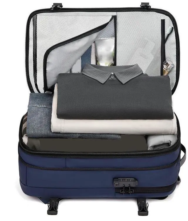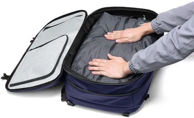 ^^ Expanded Space Utilization: The vacuum compression backpack has extra corner spaces that can be utilized for storing scattered items, which are securely held with mesh zippers, providing additional storage.