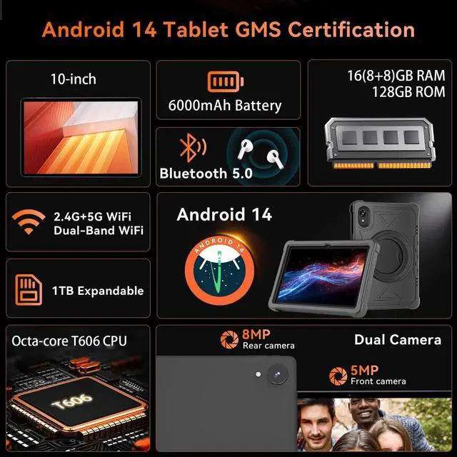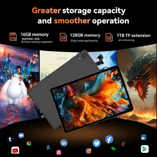 Storage: Enjoy seamless multitasking with our Android 14 Tablet, featuring 16GB RAM (8GB physical + 8GB virtual) and 128GB built-in storage. Effortlessly download apps like Netflix and Facebook from the pre-installed Play Store. Plus, 1TB TF card provides ample space for all your photos, videos, and files.