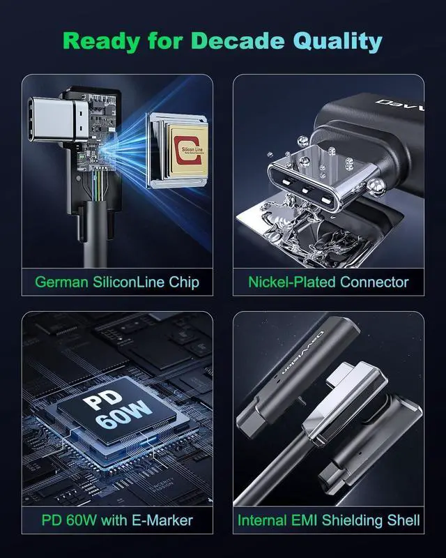 ^^ Unique Bi-Directional Transmission: Unlike traditional fiber optic USB-C cables that require fixed Host-to-Device direction, DavVision upgraded fiber optic USB cable supports true bi-directional transmission. Plug either end into your PC, camera, webcam, VR headset, or game console without worrying about orientation. Backward compatible with USB 3.0 and 2.0 for broader connectivity. ^^ Reinforced Angle Connector & Multi-Layer Shielding: The L-shaped connector minimizes the risk of port damage, ideal for compact setups like Sony A7IV/Canon R5. When paired with cable clips, it keeps setup neat and secure. Inside, each fiber usbc is individually shielded with aluminum foil, and the overall cable is wrapped in an additional shielding layer, ensuring clear, lossless transmission. ^^ 60W PD