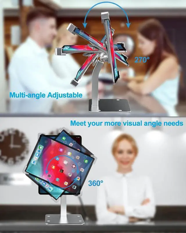 ^^ Heavy Duty and Stable DesignThe whole set make off aluminum alloy material and the base plate is very heavy ( 0.95 kg), make sure the stand is always stable even when the base plate is not fastened to the table and your device will never shake while you touching the screen. ^^ Provide Ideal Viewing for UsersThe bracket can be rotated 360 degree in the horizontal direction. In addition, the joint connecting the support rod and the bracket provides a maximum of 270 degrees of front and rear flip, providing you with more angles, especially when multiple people use it, you can quickly adjust the angle to show others without moving the stand, which is super convenient.