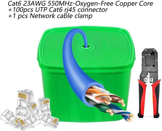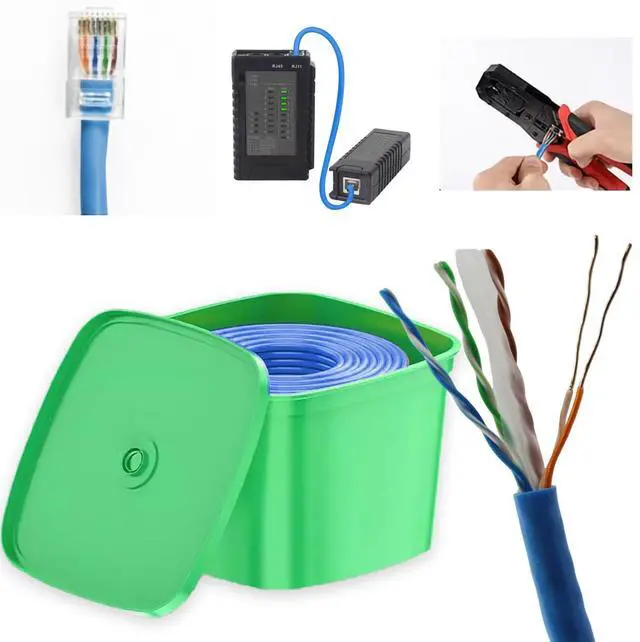 Complete Cat6 Networking Kit Includes 300ft pure oxygen-free copper (OFC) cable + 100 non-shielded RJ45 connectors and 1 crimping tool+Network-cable tester (without battery, You need to order a 9v battery separately and install it on the tester. ) (tools stored inside the cable box). DIY-ready for home theaters, gaming setups, and office networks. ^^ 300ft OFC Cat6 Cable with 100 Connectors Supports 1Gbps speeds up to 180ft. PVC jacket for indoor/outdoor use. Tools included in the box for custom-length terminations ^^