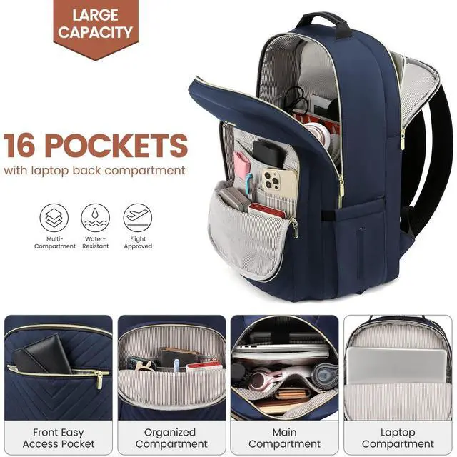 Upgraded Laptop Backpack Women: Classic V-shaped embroidery thread. Upgraded double LOVEVOOK no-slip metal zippers, water resistant Nylon fabric with polyester lining, ensures long lasting usage. Total of 4 compartments and 16 pockets for your computer, A4 folder, bottles, umbrellas, clothes, work supplies, college supplies and travel essentials.